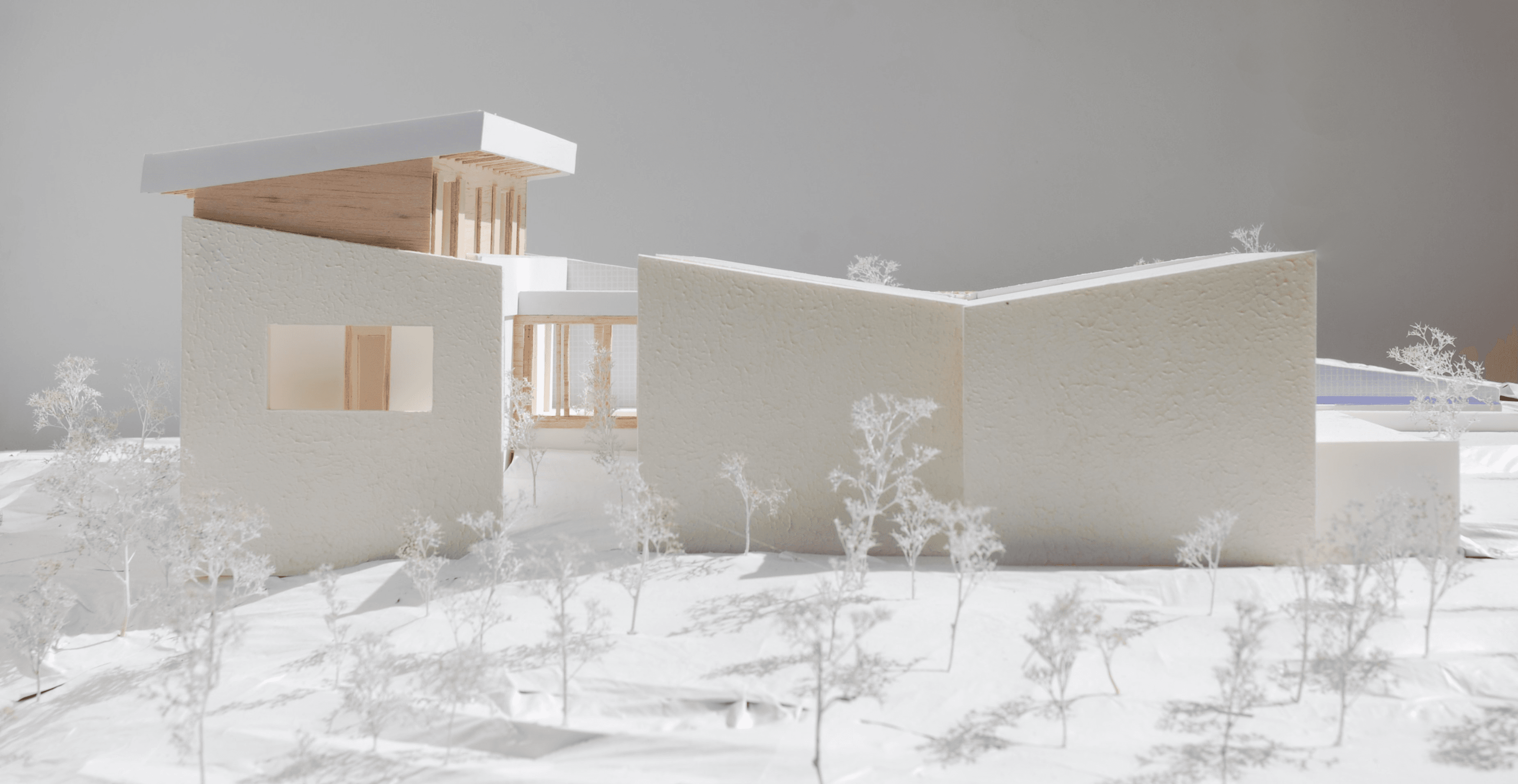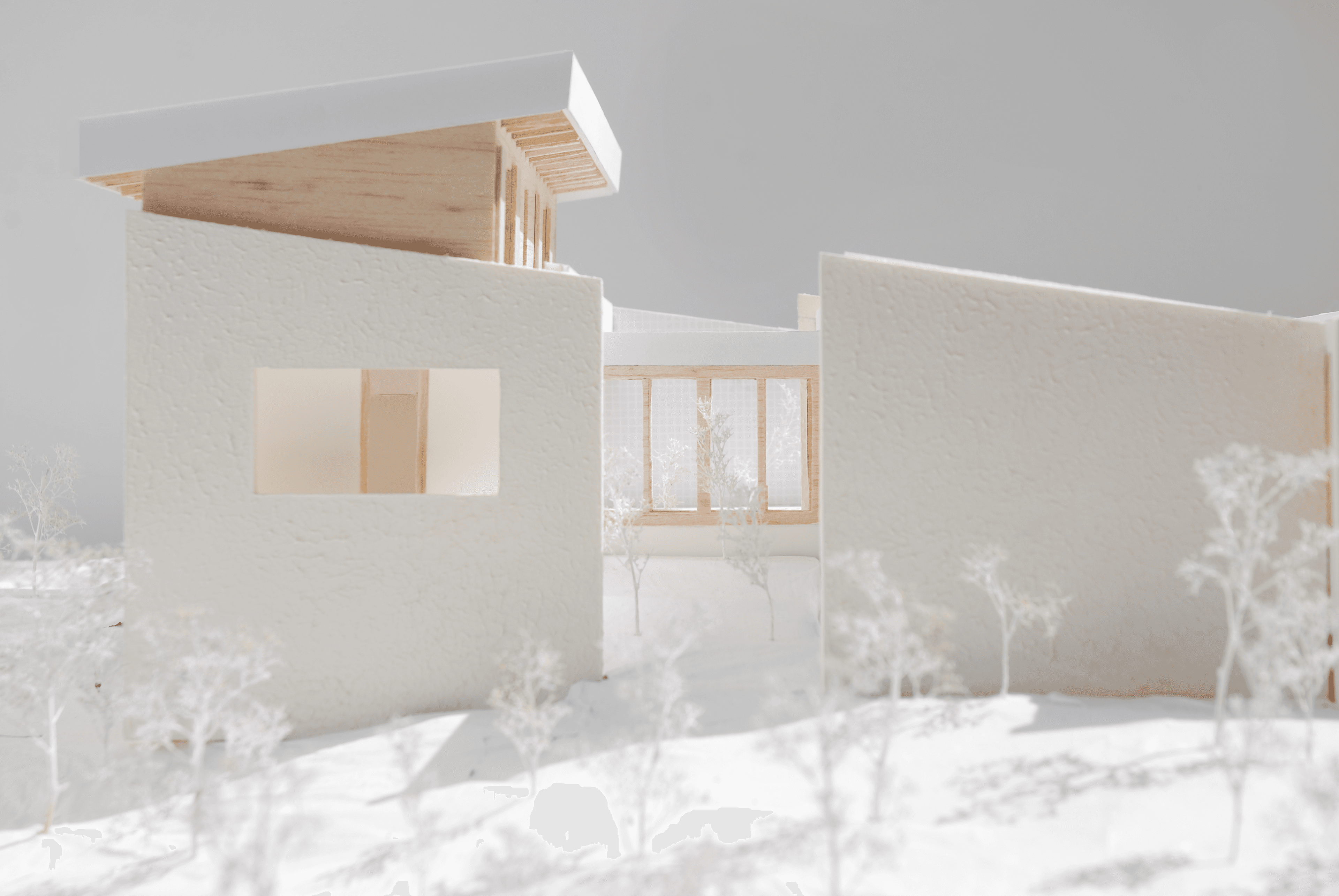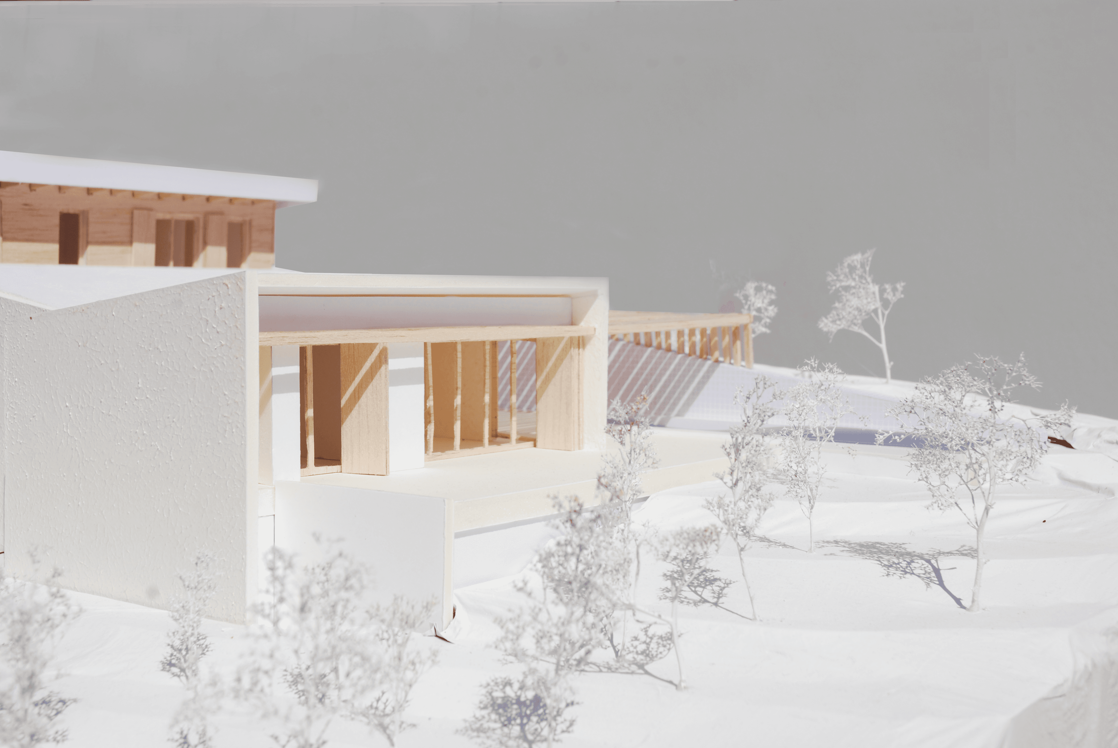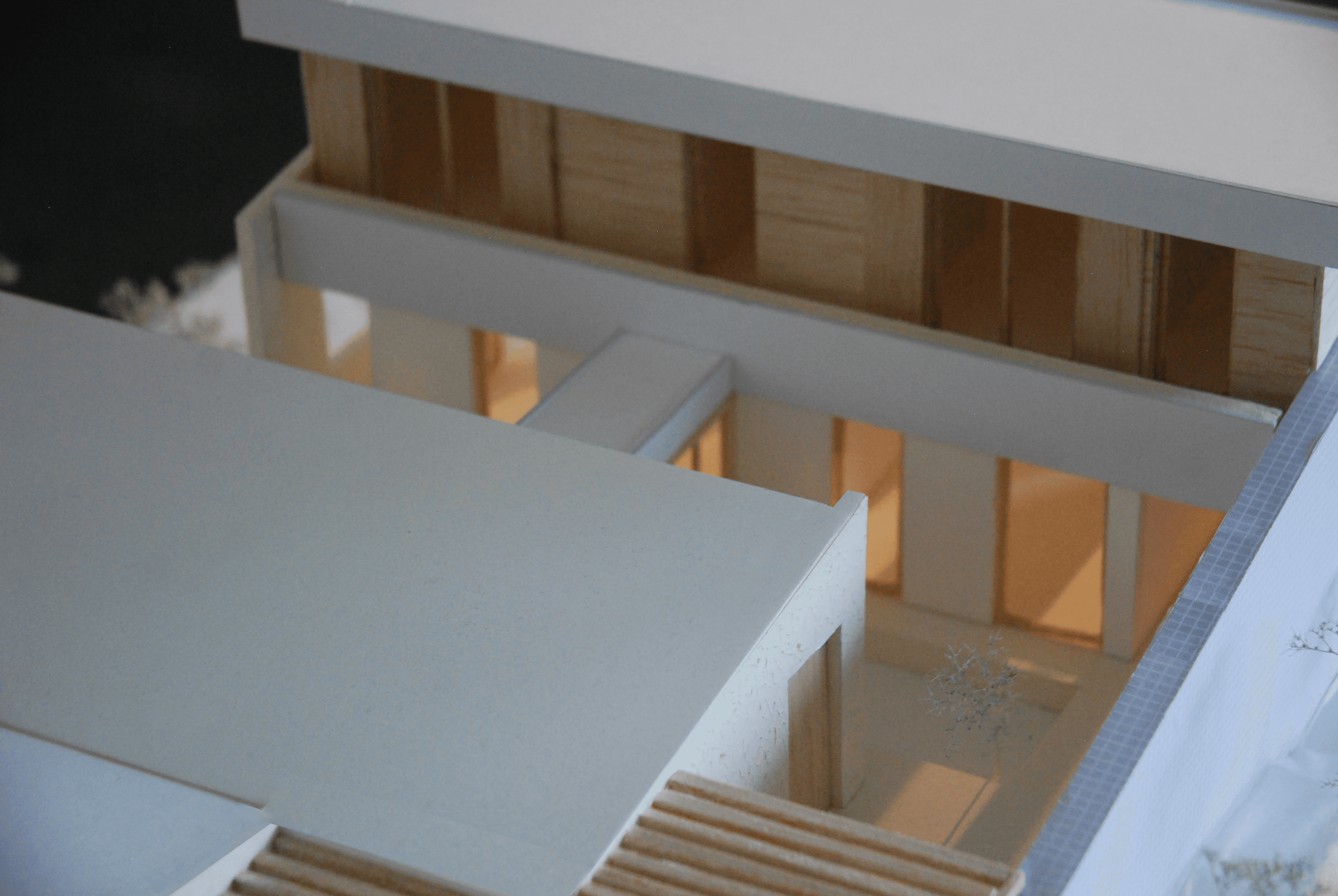 Un grand mur en pierre vient rompre le vis-à-vis potentiel futur et s'implante sur la dite limite. Ce mur vient structurer les volumes en créant un axe abrité et couvert permettant une déambulation extérieure. Trois volumes sont lisibles et identifiables, Les deux premiers s'articulent avec un léger décalage permettant de rompre le côté monolitique et de respecter la limite cadastrale. Ces deux volumes forment l'habitation principale comportant les pièces de vie ainsi qu'une chambre. Ils sont disposés face à la mer, leurs façades ouest ont de larges ouvertures. Les façades nords sont toutes aveugles afin de limiter la vue sur la colline des Molini et de concentrer la vue sur le Golf d'Ajaccio et l'Isolella.